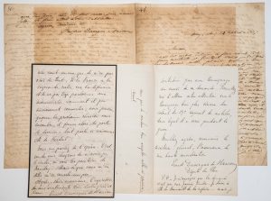 - DEAR. Family DUVERGIER DE HAURANNE. Château d'HERRY (18). 4 LETTERS: Prosper DUVERGIER DE HAURANNE Politician and Writer. One of the Leaders of the Doctrinaire Party. Organized the "campaign of the banquets" and was Deputy of the CHER in 1848 and in 1850. He suffered detention and exile. Academy Fr 1870. (Rouen 1798 - Château de HERRY, Sancergues, Cher 1881). He contributed to the Globe, the Revue Française, the Revue des 2 Mondes. Letter A.S. "Prosper Duvergier de Hauranne" written from the Château d'HERRY (Cher) on September 24, 1827, from 3pp in-4°. "Sir, what must distinguish liberal France from ministerial and Jesuitic France is justice when a public official does wrong, that nothing prevents us from withering him in the eyes of our fellow citizens. If he is doing well, let us also be able to say so, if only to prove that he is honest people everywhere. Help me therefore to pay tribute to the honourable conduct of the Prefect of the CHER in the formation of the electoral lists. Charged with the Count Jaubert, my brother-in-law, to carry to Bourges the coins of several voters, we presented ourselves yesterday at the Prefecture where we found only politeness and loyalty. No bickering, no hesitation ..." + Great Apostille A.S. of his father Jean Marie DUVERGIER DE HAURANNE Deputy of the Lower Seine in 1818 (1771-1831), on a letter from Paris in 1819 + 2 Letters A.S. of Ernest DUVERGIER DE HAURANNE (1843-1877) Deputy of the CHER (L.A.S. of 1872 at the head of the National Assembly and one from Menton 1875).