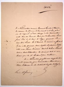 1834) «Mr LAMARTINE remercie vivement Monsieur le Ministre du Commerce (THIERS) des secours si bien accordé et si bien placé sur Mme AGOULT. Il est chargé à lui transmettre aussi non une demande mais une réclamation bien fondée d'un de ses amis Mr Edgar QUINET... en faisant justice à Mr QUINET (il) aura le plaisir d'être utile à un jeune écrivain dont le talent promet tant à notre littérature. Mr QUINET est de ces hommes qui ne se laissent pas oublier. Mr de LAMARTINE profite avec empressement de cette circonstance pour renouveler à Monsieur THIERS l'assurance de ses sentiments distingués.» Adolphe THIERS est Ministre du Commerce en déc. 1832 à 1834, il deviendra Président de la République en août 1871 (1797 - 1877); Edgar QUINET, est Historien, Philosophe et Homme politique (1803-1875).