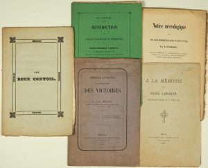 - NORTH. DOUAI. CAMBRAI. 5 Printed booklets: "LES DEUX CONVOIS, par M. MINART" (Retour des cendres de Napoléon. 1840). The Songs. The Procession. The Prayer. - Printed in DOUAI, at de Wagrez' house; Without date. 14pp in-8° + "Notice nécrologique sur M. le Comte de GUERNE, par M. DUTHILLOEUL. Extract of the Memoirs of the Royal and Central Society of Agriculture, Sciences and Arts of the Department of the NORTH, séant in DOUAI (1845-1846). Printed in DOUAI, Adam D'AUVERS, Printer. 1847; 16pp in-8° + "400th Anniversary. Blessing of the Collegiate and Parish Church of SAINT PIERRE in DOUAI, July 26, 1750, preceded by a notice of this Church, with lithograph. Second edition for the benefit of the Salle d'Asile. - Printed at DOUAI, by M. Veuve LE MALÉ; 1850; 16pp in-8°. + Hommage et Prière à Notre-Dame des VICTOIRES" (Homage and Prayer to Our Lady of the Victory) by M. l'Abbé MOURON, Professor in the institution under the same name in Roubaix. Printed in CAMBRAI, at Alex's house. REGNIER-FAREZ. 1861. 15pp in-8° + "In memory of René CARMIER who died piously on April 19, 1885. Printed in DOUAI, by Louis DECHRISTÉ Père. 1885; 20pp in-8°.