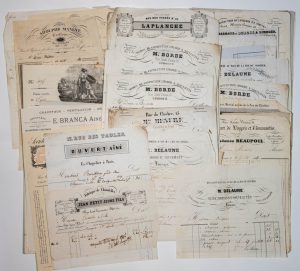 - HAUTE-VIENNE. LIMOGES (87). Set of 79 invoices from Limoges merchants from 1840 to 1908. Some with engraved headings. Nice set. (fashion and novelties, corsets factory, pharmacy, Hatter, Seamstress in dresses, Bookshop, pastry, Rolling, hairdresser, insurance policy, haberdashery...)