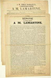 2) Adresse de BARILLOT Ouvrier-Imprimeur-Lithographe: “Réponse aux calomnies adressées à Mr LAMARTINE.” - Imprimerie de la Soupe, passage du Ponceau 18 et 20 - 5 centimes - “Les crieurs pourront d'adresser cher l'auteur Rue du Temple - 1p (31 x 44).