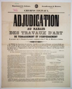 - ARDENNES. 1849. Borough of MÉZIÈRES. CHEMINS VICINAUX: 1°) Awarding at a discount of the Works of Art, earthworks and stonework to be carried out on the main road N°16, from Mézières to Sedan (08). Awarding at a discount of the construction works of a masonry bridge over the river Vrigne, in the crossing of VRIGNE-AUX-BOIS, estimated 9000 Frances Opinion of the Prefect of the Ardennes, Knight of the Legion of Honour T. FOY, in Mézières on November 30th, 1849. General conditions and charges of the auctions. Model of submission. Imprimerie de Lelaurin-Martinet, in Mézières.