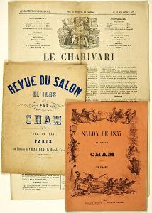 - CHAM Draftsman, Illustrator. 3 Prints: "REVUE DU SALON de 1853 par CHAM"; Printed in Paris at the CHARIVARI Office, 16 Rue du croissant. 16 pages in-4° + "SALON OF 1857 illustrated by CHAM." Printed in Paris, Librairie Nouvelle. Bureau du CHARIVARI; 15pp in-4° + "LE CHARIVARI" Journal of January 26, 1874, 4pp in-folio. With Drawing of CHAM representing the Writer Alexandre DUMAS Fils going to the door of the Institute (He will enter the Academy.)