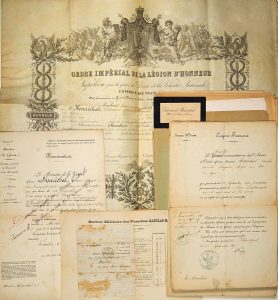 Nominations signées du Maréchal VAILLANT, Paris 1856; Brevet gravé (41 x 52) de l'Ordre Impérial de la LÉGION D'HONNEUR de 1855 (griffe de Napoléon III); Il fit la Campagne de 1870 et le Siège de Paris 1871. (Lettre de Ballon (timbre découpée); Nominations, États de services, correspondance et papiers divers. Bon dossier.