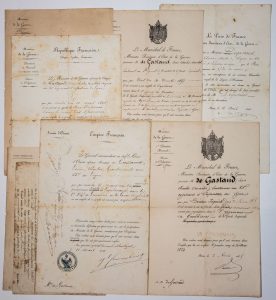 Chevalier de la Légion d'Honneur - P.S. MONTHYON Ministre de la Guerre - 3) Certificat de Chevalier de la Légion d'Honneur, P.S. Vicomte de SAINT MARC 1846 - 4) Sous-lieutenant, 17 avril 1848 - 5) Lieutenant au 61° Régiment de Ligne, 1852, P.S. du Maréchal de SAINT ARNAUD - 6) ARMÉE D'ORIENT, Nomination provisoire de Lieutenant dans le 1er Régiment de Grenadiers de la Garde Impériale; Q.G. devant SÉBASTOPOL 11 mars 1855; P.S. du Gal CANROBERT (futur Maréchal); cachet “Le Comm. en Chef de l'Armée d'Orient” - 7) Lieutenant au 1er Régiment de Grenadiers de la GARDE IMPÉRIALE; P.S. du Maréchal VAILLANT, vignette & cachet à sec, 1855 - 8) Nomination de Capitaine au 1er Régiment de Grenadiers de la GARDE IMPÉRIALE - P.S. du Maréchal VAILLANT, 1858; vignette & cachet à sec.