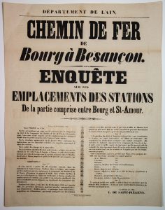 - AIN. JURA. DOUBS. Creation of the "CHEMIN DE FER de BOURG à BESANÇON. Survey of the locations of the stations in the part between BOURG and ST-AMOUR (Jura)." Order of the Prefect of the AIN, Léon de SAINT-PULGENT, made in Bourg on December 24th, 1861. Printed in Bourg, at Dufour's. Poster (50 x 64 cm) State A.