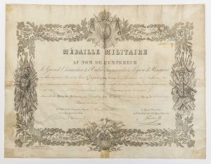 - MILITARY DECORATIONS. 4 Diplomas: Patent of the MILITARY MEDAL decoration, in the name of the Emperor. May 1870 (33 x 43) + Diploma of the Legion of Honour 1884. (43 c 54,5) + MILITARY MEDAL 1954 (35 x 49) + Brevet de Chef de Section 1955 (30 x 40 cm)