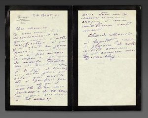 Jeune fille à l’ombrelle), disparue le 6 février 1899. Lettre adressée à Louis Bonnier, architecte des Bâtiments civils et des Palais nationaux, que lui avait présenté son ami Ferdinand Deconchy, dont il était le beau-frère. Bonnier eut la charge d’élaborer en 1920 les premiers projets pour la construction d’un local destiné aux Grandes Décorations. Pour lui demander de prévenir son vérificateur, qu’il ne pourra le recevoir à Giverny à la date convenue : « … ayant du monde Dimanche et Lundi prochain, je le prie de choi-sir un autre jour… ».