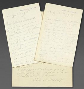 Claude Monet - l.a.s.  « Claude Monet » Giverny 21 juillet 1915, 2 pp 1/2 in-8, écrites au crayon gras sur du papier à en-tête de la propriété de Giverny. à l’architecte Louis Bonnier. La construction du ’’ grand