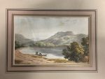 Lac en montagne avec trois personnages prêts d'une barque.