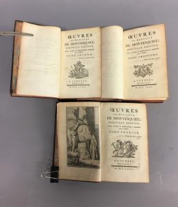 MONTESQUIEU. Œuvres. — Nouvelle édition. — Londres, Nourse, 1772. — 3 volumes in-8reliés veau marbré èpoque, dos à nerfs ornés, tranches rouges. (dos fanés, défauts d'usage).