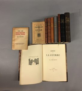 — Adieu à la guerre. Paris, Grasset, 1919. In-4 relié demi-basane fauve à coins, dos à nerfs, couvertures conservées. Tirage à 350 exemplaires numérotés sur vélin du Marais.
