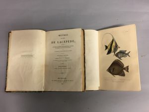 LACEPEDE (Comte de). — Œuvres. — Bruxelles, Lejeune, 1833-1838. — 5 volumes in-8 reliés demi-basane verte de l'époque. (reliures très endommagées, mouillures sur plusieurs volumes).