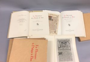 - Camille GASPAR. Le Pontifical de l'Eglise de Sens. Bruxelles, Œuvre nationale pour la reproduction de manuscrits à miniatures de Belgique, 1925. Grand in-4., 42-(4) pp., 21 planches en couleurs et 6 planches documentaires en noir ; chemise à rabats, emboitage. Tirage à 810 exemplaires, un des 173 nominatifs et numérotés sur papier d'Arches.