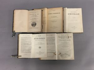 — RANVIER (L.). Traité technique d'histologie. Paris, Savy, 1875. In-8 relié demi-chagrin, dos à nerfs. Édition originale. Figures dans le texte. Ex-libris manuscrit de Lagrange. - BOUCHUT (E.). Traité pratique des maladies des nouveaux-nés des enfants à la mamelle et de la seconde enfance. Paris, Baillière, 1873. In-8 relié demi-basane, dos lisse orné de filets dorés. (dos passé, quelques rousseurs). 179 figures dans le texte.