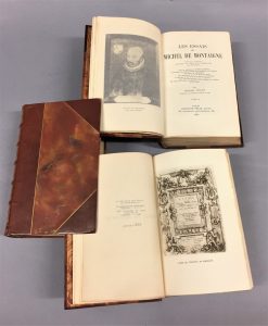MONTAIGNE (Michel, de). — Essais de Michel de Montaigne. — Nouvelle édition conforme au texte de l'exemplaire de Bordeaux. — Par Pierre Villey. — Paris, Alcan, 1930. — 3 volumes in-8 reliés demi-chagrin havane à coins, dos à cinq nerfs...