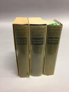 PLÉIADE —. (volumes de la). — [Géographie]. — 3 volumes reliures éditeur, jaquettes, rhodoïds, 2 étuis/3. — Géographie générale, 1966. — Géographie régionale, T.1, 1975. — Ethnographie régionale, T.1, 1972.