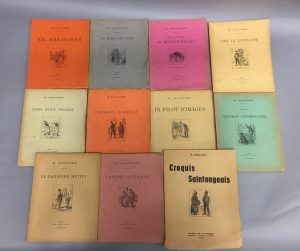 (52 planches). — En Galoches (52 planches). — Chez la Genuche (52 planches). — Les paisans d'Aneut (52 planches). — La darniare métive (41 planches). Royan, Victor Billaud, s.d. (ca 1890) ; 10 volumes in-4 brochés, couvertures de couleurs différentes illustrées d'une vignette.