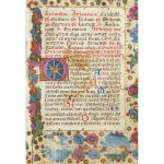 318 ff., complet (un feuillet découpé dans sa marge inférieure au fol. 128, peut-être avec un petit manque de texte et de décor au verso), précédés et suivis de deux gardes de papier, écriture gothique arrondie, fortement abrégée, à l'encre brune, parchemin réglé à l'encre brun pâle, texte sur 24 lignes (justification : 42 x 55 mm), rubriques en rouge, initiales peintes en rouge ou bleues, certaines plus grandes (3 lignes de hauteur) avec décor filigrané en rouge ou bleu, avec plusieurs initiales ornées et enluminées, peintes de couleurs sur fonds d'or bruni avec prolongations dans la marge (décor de fins rinceaux, motifs de couleur, acanthes colorées, fleurs et feuillages), quelques feuillets avec initiales prolongées par des baguettes dorées (or bruni) et motifs ornementaux (par exemple fol. 27v), 5 feuillets avec bordures complètes enluminées (ff. 14, 120, 128v, 138v, 152v), 2 bordures historiées (médaillons) (ff. 14 et 120), 2 initiales historiées (ff. 14 et 128v) et 2 initiales avec étoile (fol. 120, 293).