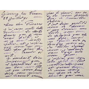 MONET (Claude) (1840-1926) — L.A.S. adressée à Camille Pissarro — Giverny, 22 juillet 1891 0151 — 3 pp., bi-feuillet in-8, encre violette.