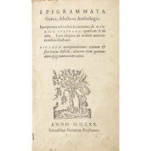 Importante édition en partie originale, imprimée avec soin par Henri Estienne, de l'Anthologie grecque : 260 épigrammes publiée par Estienne en 1566, enrichie de ses propres traductions de prose latine et de la traduction de vers de lui-même et de Paulus Melissus.