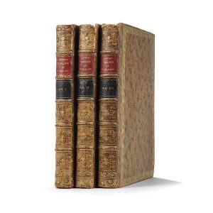 Reliure usagée : manques aux coiffes, frottements ; tome I, charnière sup. très fendue, plat prêt à se détacher.