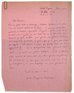 IL EST JOINT UNE LETTRE AUTOGRAPHE SIGNÉE SUR PAPIER ROSE DE FÉVRIER 52 UNE PAGE IN-4 AU DIRECTEUR DE LA REVUE LA RUE POUR EXPLIQUER SON TEXTE EN HOMMAGE À ANTONIN ARTAUD.