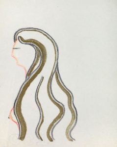 Le dessin aux crayons de couleurs et rehaussé d'or représente un buste de femme nue de profil, à la longue chevelure.