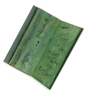 BALTAZAR (Julius) — Quelques vert à pied. — Ile-Rousse, Baltazar, juillet 2001. — In-12 étroit (19,7 x 9,5 cm) monté sur onglets, veau teinté en vert bronze et poncé irrégulièrement, décor de petites formes colorées à l’œser...