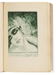 floraux crème et spirales en noir, dos lisse avec titre à l’œser vert, auteur et artiste à l’œser mauve, doublures et gardes de papier, couvertures et dos conservés, étui (D.-H. Mercher - 1991).