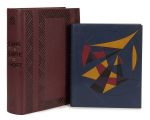 mêmes chevrons à froid, dos lisse orné de deux médaillons carrés de mêmes chevrons à froid et du titre en grandes lettres à froid et dorées, encadrement intérieur de maroquin prune avec un filet doré et un filet à froid, doublures de peau velours marron, gardes de soie moirée cramoisie, tête dorée, couvertures et dos conservés, chemise et étui (Georges Cretté).