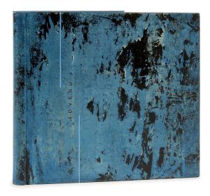 BENOIT (Pierre-André) — Advenu. — Alès, PAB, janvier 1961. — In-12 carré (13,3 x 14,3 cm), veau bleu-vert teint et partiellement poncé, avec des parties noires, sur les plats filets verticaux à l’œser bleu ciel, titre vertical à froid...