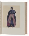 dessin à froid avec rehauts, enchâssée au premier plat, reprenant la figure féminine du frontispice, dos lisse orné de jeux de filets dorés avec nom d’auteur et titre dorés et d’une rose des vents estampée à froid, encadrement intérieur de maroquin rouille avec jeu de filets dorés et de veau crème, doublures et gardes de soie moirée gris perle, couvertures et dos conservés, tranches dorées, chemise et étui (Semet & Plumelle).
