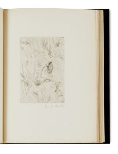 Tirage à 77 exemplaires au format in-4 tellière, celui-ci un des 43 sur papier vergé de Montval (n° XXXIX), comportant 4 gravures originales hors texte de Max Walter Svanberg, Vieira da Silva, Simon Hantaï et Wolfang Poalen, chacune signée au crayon. Seuls les exemplaires au format in-4 tellière contiennent ces gravures.