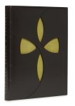 fente en courbe en tête et en pied de chaque plat, dos lisse avec titre au palladium, tranches dorées, doublures de box aubergine avec noms des auteurs au premier plat, des artistes au second plat, dorés en méli-mélo autour des feuilles du trèfle, gardes de peau velours vert-jaune, couvertures conservées, chemise, étui (Renaud Vernier - 1992 - E. D. Claude Ribal).