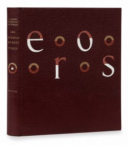 blanc et brique incrustées en relief, alternant avec des cercles incrustés en creux faits de maroquin brique et sable, sur le second plat, cercles concentriques en creux et en relief de maroquin brique, sable et blanc, dos lisse orné de deux cercles enchâssés faits de maroquin sable, brique et blanc, incrustés en relief, tête dorée, doublures et gardes de peau velours grise, non rogné, couvertures et dos conservés, chemise et étui (Richard - 1997).