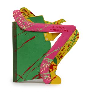 BUTOR (Michel) — Le Retour du boomerang. — Paris, PUF, 1988. — In-12 (21,5 x12,5 cm), demi-veau vert bronze, plats déstructurés et ajourés peints en vert avec coulures de peinture rouge, en gouttière sont vissés des boomerangs en plastique...