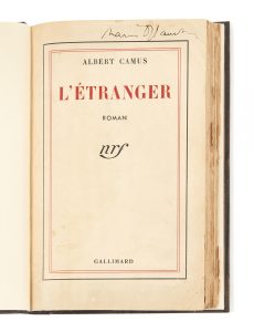 CAMUS (Albert) — L’Étranger. — Paris, Gallimard, 1942. — In-12 (18,6 x 11,5 cm), veau teinté taupe, sur les plats décor de traits noirs, souples et verticaux et de légères éraflures de même couleur, avec deux toutes petites touches à...