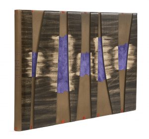 CHAR (René) — Contre une maison sèche. — Paris, Jean Hugues, 1975. — In-folio à l’italienne (38,5 x 56 cm), veau vert olive orné sur les plats d’une mosaïque en daim violet, en partie recouverte par une succession de formes verticales...