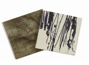 L’une et l’autre. Alès PAB, 1957. In-16 carré (8,9 x 8,9 cm), veau blanc imprimé d’un motif abstrait anthracite avec de petites touches d’œser vert et rouge, titre à froid à la verticale sur le premier plat, doublures et gardes de peau velours grise, boîte (Sánchez-Álamo – 2009).
