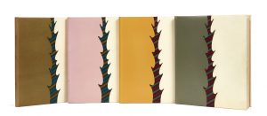 COLLECTIF — Poèmes des quatre saisons. — Paris, Éditions « Odé », 1942. —4 vol. pet. in-4 (28 x 22,2 cm), chaque volume en demi-box coloré (ocre, gris-vert, vert kaki, rose) et large bande de parchemin, avec décor mosaïqué sur les...