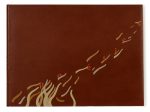 en lettres de veau corail incrusté à niveau, plat inférieur orné en pied d’une petite composition de pièces de veau incrustées à niveau, dos lisse orné de 4 bandes ondoyantes de veau incrustées en relief, titre à la chinoise poussé à l’œser crème, non rogné, doublures et gardes de peau velours grise, couvertures et dos conservés, chemise et étui (Richard – 1996).