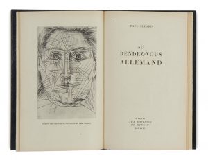 ÉLUARD (Paul) — Au rendez-vous allemand. — Paris, Éditions de minuit, 1944. — In-8 (21 x 13,2 cm), reliure à encadrement de box noir, plats de box noir partiellement poncés sur différents niveaux, le premier plat agrémenté en outre de 6...