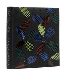 FARGUE (Léon-Paul) — Les Illuminations nouvelles. — [Paris, Textes Prétextes, 1953]. — In-4 (31,8 x 25 cm), chagrin noir, décor floral composé de grandes pièces mosaïquées de box noir gouaché dans les tons jaune, bleu, vert et orangé,...