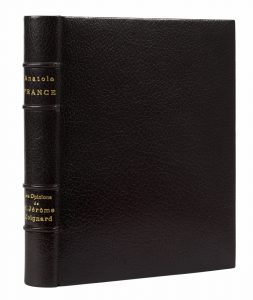 FRANCE (Anatole) — Les Opinions de M. Jérôme Coignard. Paris, Les Cent Bibliophiles, 1914. — In-4 (29,6 x 22,7 cm), reliure janséniste maroquin aubergine, dos à nerfs, auteur et titre dorés, larges encadrements intérieurs ornés d’un...