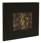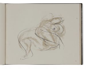 reprenant la silhouette de la Vénus de Lespugue, dos lisse avec titre à la chinoise fait de lettres en relief de maroquin noir partiellement poncé, doublures et gardes de peau velours gris-vert, tranches dorées, couvertures et dos conservés, chemise et étui (Leroux – 1965).