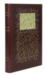 de traits à l’or, au palladium et à l’œser couleur cuivre brillant, s’échappant du cadre et recouvrant partiellement un large rectangle de veau vert pomme mosaïqué, dos lisse, auteur, artiste et titre dorés, doublures et gardes de peau velours gris rosé, tête dorée, couvertures et dos conservés, étui (M. Richard - 1989).