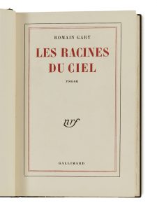 GARY (Romain) — Les Racines du ciel. — Paris, Gallimard, NRF, 1956. — Petit in-8 (20,4 x 13 cm), demi-veau vert olive à bandes, sur les plats deux bandes de feuilles de bois vert sous-bois, bande centrale de veau ivoire avec pièce incrustée...