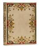 d’un filet doré, avec pastilles de maroquin vert mosaïqué aux angles, dos à nerfs orné du même décor avec titre et année, tranches dorées, doublures de maroquin lavallière ornées d’un décor mosaïqué de feuillage dans les tons havane, cerise et vert, gardes de soie moirée crème, doubles gardes de papier décoré, boîte ornée du même décor (Charles Lanoë del. R. D.).