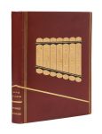 rehaussées de pastilles dorées, triples filets dorés verticaux et titre de l’ouvrage doré au centre du décor, sur les plats jeu de trois filets dorés verticaux de part et d’autre du décor central et longue bande de maroquin beige oblique dans le tiers inférieur des plats, rehaussée de pastilles dorées enjambant le dos, dos lisse avec auteur et titre dorés, tranches dorées, doublure de veau crème dans un encadrement de maroquin noir et de maroquin brun avec pastilles dorées, gardes de soie moirée crème, chemise et étui, couvertures et dos conservés. (M. Bernard - 1929).